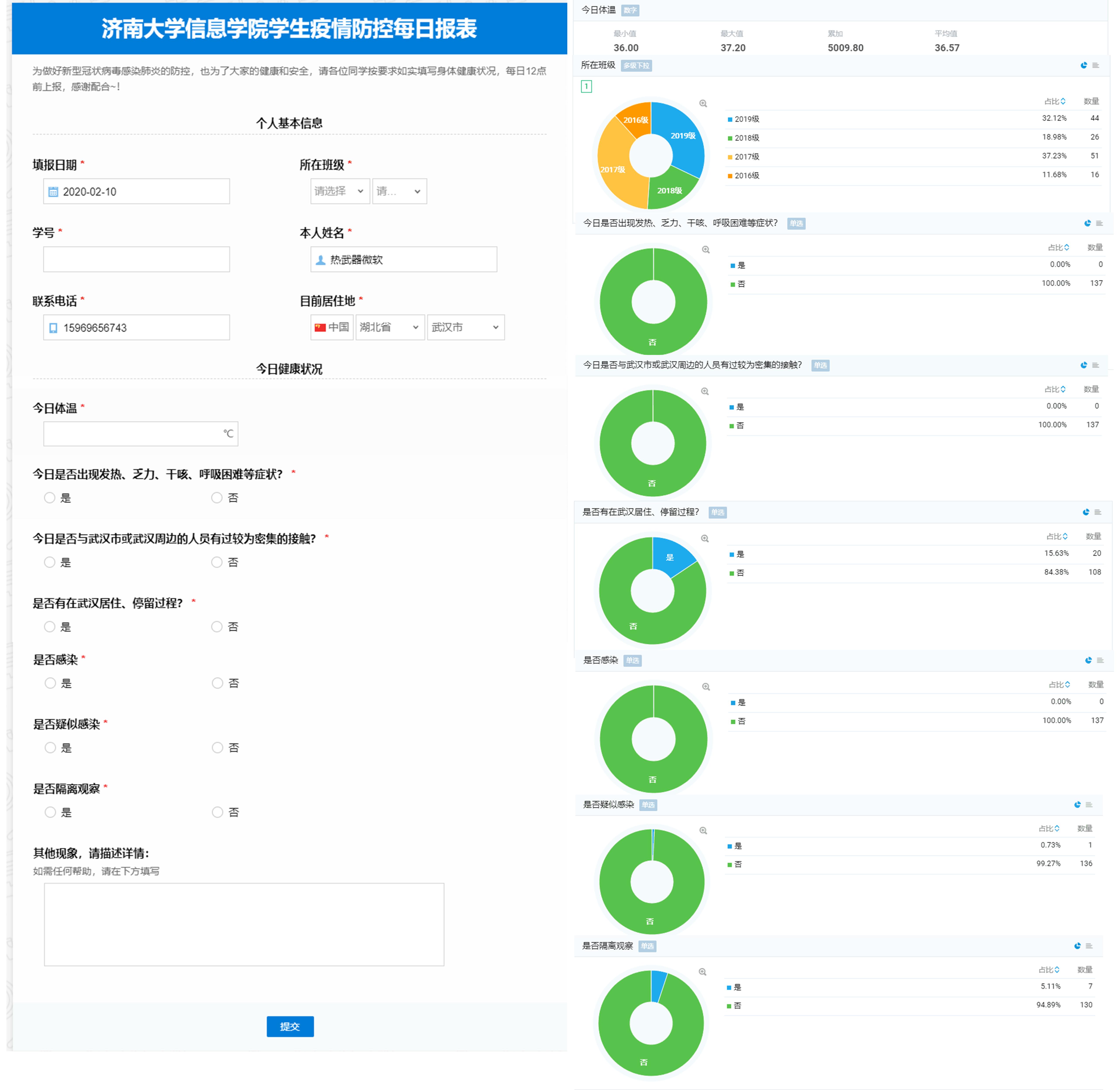 对于学院教职工,建立系部主任定期汇报制度,对本系部教师情况进行摸排汇总,并及时汇报;对全体学生,以年级、班级为单位,建立辅导员—主要学生干部—全班学生的疫情防控信息网,每日排查班级同学身体健康情况并汇总上报,实时掌握全院学生情况,并及时通过网络宣传、群发通知等方式号召同学们响应国家和学校号召,服从当地、学校、学院疫情防控工作安排,居家做好科学抗疫的带头者;对有湖北地区停留史、与相关人员有接触以及疫情较严重地区的学生及时进行完善摸排,推出“太阳成集团tyc539信息学院学生疫情防控每日报表”系统,通过系统可快速、全面的掌握学生每日动态信息,更有针对性的做好疫情防控工作。