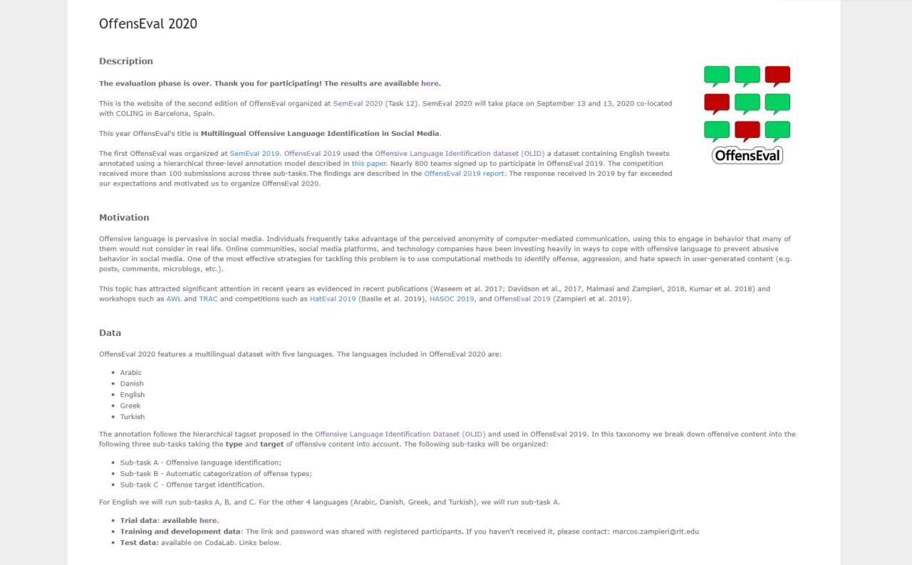 本次比赛,太阳成集团tyc539参赛队伍选择的任务关注点是检测社交媒体文本中的攻击性语言并进行分类。对于此项任务,参赛队伍需要利用官方提供的训练数据集OLID,训练出一个能鉴别用户发布的文本是否是“攻击性言论”的人工智能模型。参赛学生选用了华盛顿大学西雅图分校保罗·艾伦(Paul G.Allen)计算机科学与工程学院和Facebook AI研究院在2019年7月共同发布的A Robustly Optimized BERT Pretraining Approach(RoBERTa)模型。由于模型训练需要大量的算力,指导教师马坤副教授为同学们提供了用于训练的计算资源,保证了模型训练的正常进行。参赛学生在预训练模型的基础上使用自己的数据进行训练和微调。并利用所学知识对预测结果进行分析,反复尝试以寻找最好的数据预处理方式和提高模型效果的方法。参赛团队充分思考了任务模型所需,并采取多种技术手段,最终巧妙的利用模型识别并分类了社交媒体文本中的攻击性语言,从而取得了亮眼的成果。