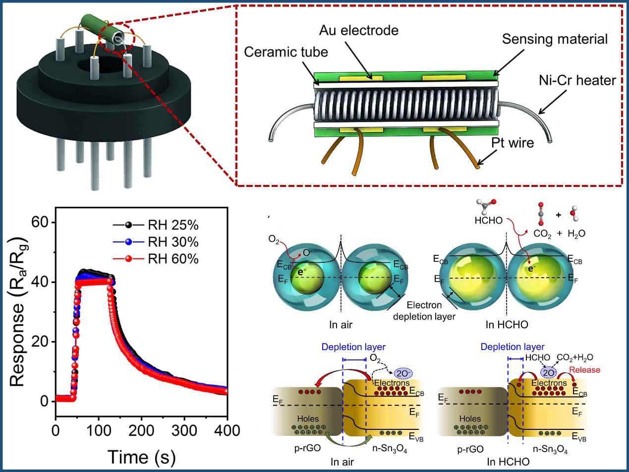 由于在生产过程长期接触甲醛气体会导致许多潜在的健康风险,因此设计高性能的甲醛气敏传感器并将其应用于工业生产和环境气体监测过程的研究引起了广泛的研究兴趣。基于金属氧化物半导体的甲醛气敏传感器由于其具有较高的传感响应强度、操作简单、成本低等优点而迅速成为最有前途的甲醛气敏平台。但是,这种传感器必须在较高的操作温度下才能获得理想的传感响应强度,这是基于金属氧化物半导体的气敏传感器固有的缺点。而该课题组通过简单的水热法成功制备了基于Sn3O4/ rGO的花状异质结构的甲醛气敏传感器,有效提高了其在低温下工作的能力。特别的,该传感器在不同环境湿度条件下对甲醛气体的传感性能没有明显的变化,显示出优异的抗湿性能。
