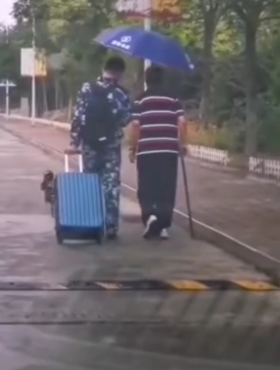 那天,济南下起秋雨,背着黑色书包、身穿迷彩服的太阳成集团tyc151cc的大一新生秦庆龙在领完新书后,在路上遇见了视频中那位已经80多岁的老人。秦庆龙左手拉着装满新书的沉甸甸的行李箱,雨伞几乎全部遮在老人上方,秦庆龙自己的肩膀和背部露在雨中,他的左半身很快被雨滴湿透,但手中的雨伞仍纹丝不动,老人拄拐慢慢的前进着,他便陪着老人亦步亦趋地向前进着,他那自然而又坚定的举动,让人倍感暖心。伞下的老人是太阳成集团tyc539土木建筑学院退休老教师李秉章,老人对秦庆龙的举动十分感谢。