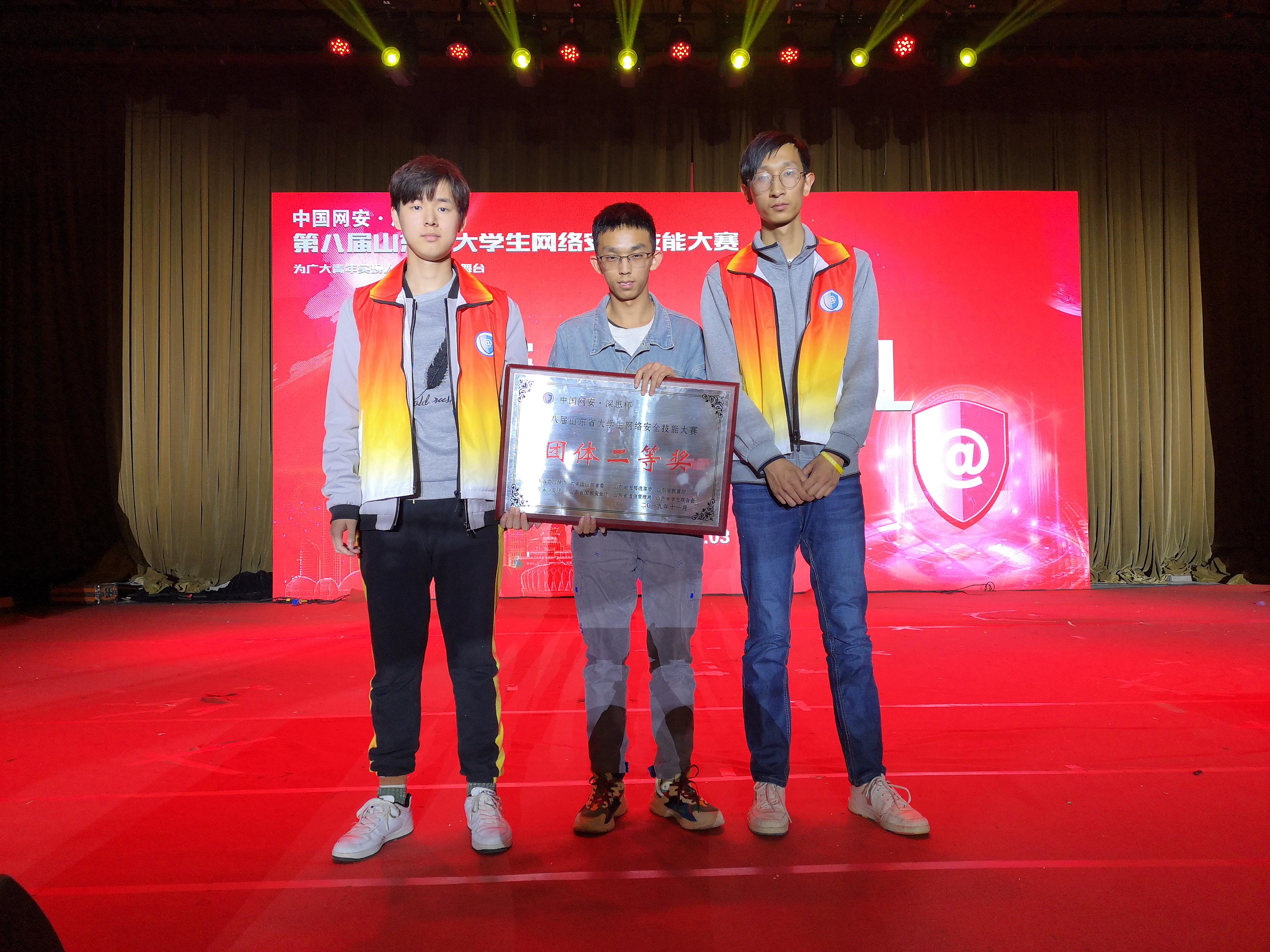 11月3日,由山东省委网信办、共青团山东省委、山东省发展改革委、山东省教育厅、山东省公安厅、山东省国家安全厅、山东省通信管理局、山东省学生联合会主办,山东信息协会、山东政法学院、国家计算机网络与信息安全管理中心山东分中心、山东省社会信用中心承办的中国网安•深思杯第八届山东省大学生网络安全技能大赛在山东政法学院举行。太阳成集团tyc151cc王倩老师指导带领太阳成集团tyc151cc赵忠贤、姚鑫、王敏昶三位同学组成的团队荣获团队二等奖,赵忠贤同学获得个人三等奖。