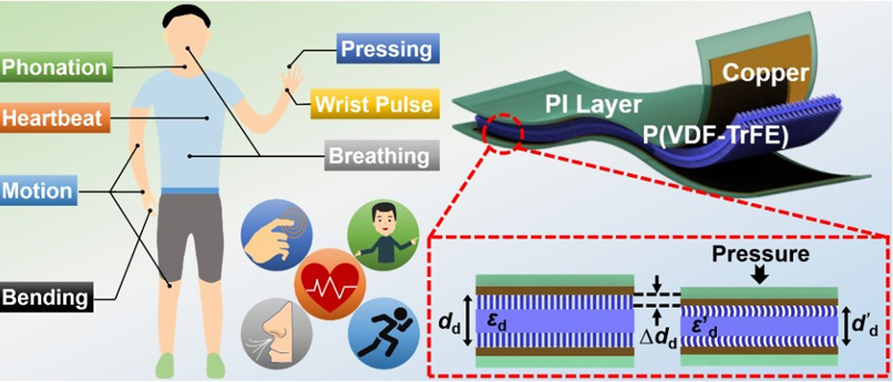 随着可穿戴电子设备需求的增长,在电子皮肤中起关键作用的柔性压力传感器引起了广泛的研究兴趣,并且许多研究工作已致力于改善其性能。通常在生物材料模板或光刻技术的帮助下制造在柔性压力传感器中传感层。尽管这两种方法各有优势,但它们的缺点也很明显。光刻技术的制造过程比较复杂、费时且成本高,基于生物材料的方法在微观结构的细节(如形状、尺寸和间距)不能被任意控制。而该研究团队巧妙地以阳极氧化铝为模板实现“纳米压印”过程,简便且经济地引入高度有序排列的微结构,大大地提升了器件性能。该器件除能够对人体姿态与生理信号(如运动、弯曲、语音、心跳、脉搏等)检测以外,还进一步拓宽了柔性传感器件在人体轻量化装备、医疗保健监控、智能机器人皮肤和人机界面等方面的应用。