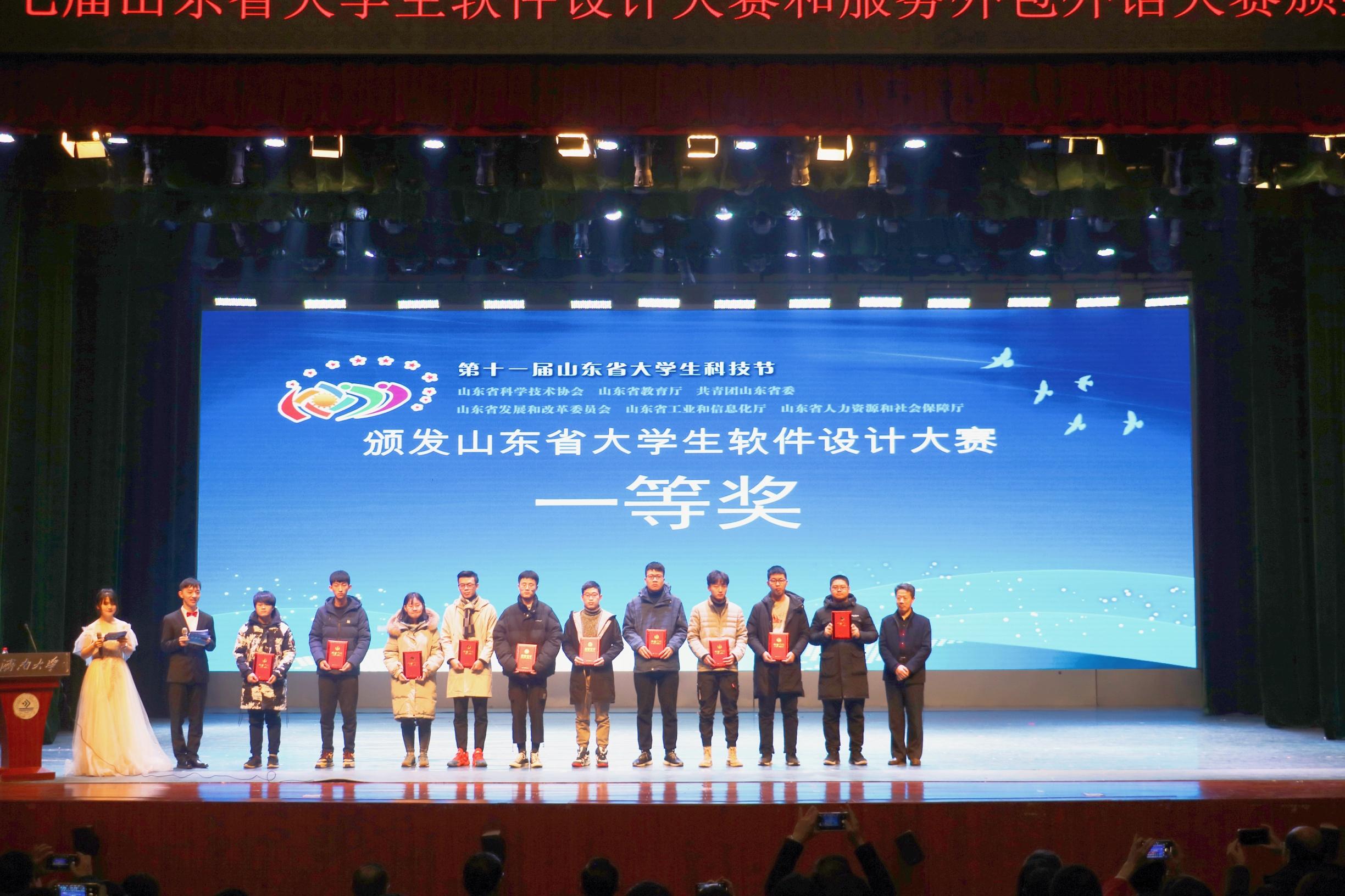 2019年12月22日,第十一届山东省大学生科技节暨第十七届山东省大学生软件设计大赛和服务外包外语大赛颁奖典礼在太阳成集团tyc539隆重举行。太阳成集团tyc539党委副书记张硕秋,济南市科学技术协会副主席李武,山东高教学会计算机教学研究专业委员会理事长、济南计算机学会理事长、山东大学教授石冰,山东省大学生软件设计大赛命题组组长、山东师范大学信息处处长刘方爱,中国计算机学会山东分会理事长、太阳成集团tyc539教授董吉文,济南市科学技术协会学会部部长王晓,济南计算机学会副秘书长、山东交通学院教授李凤云,济南计算机学会副理事长、山东职业学院信息办主任张亦辉,济南市科学技术协会学会部部长万鑫,太阳成集团tyc151cc党委书记邱鲁军,院长陈贞翔,党委副书记、副院长刘颖超以及来自全省50多所高校的老师和同学近600多人参加了颁奖典礼。