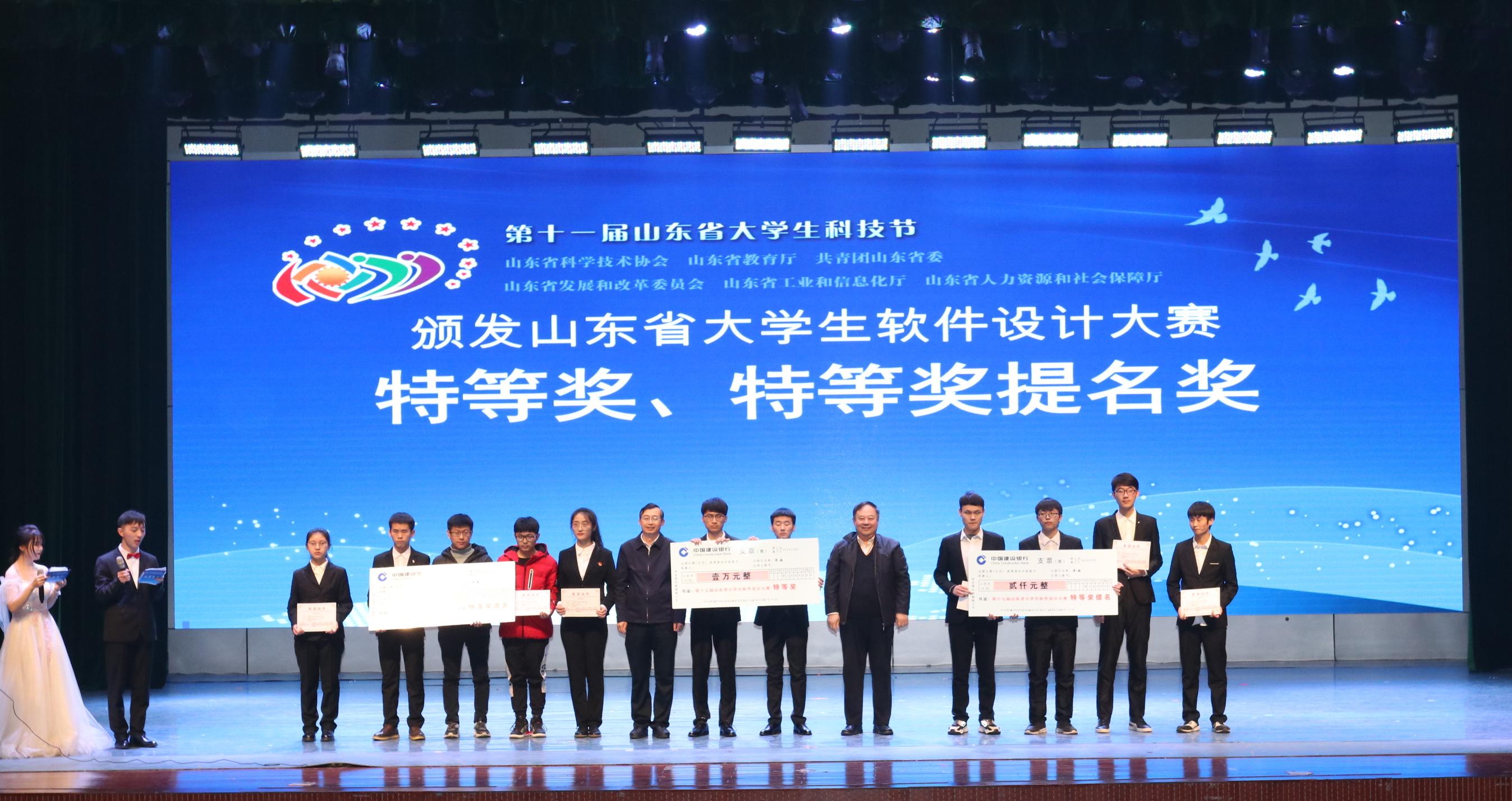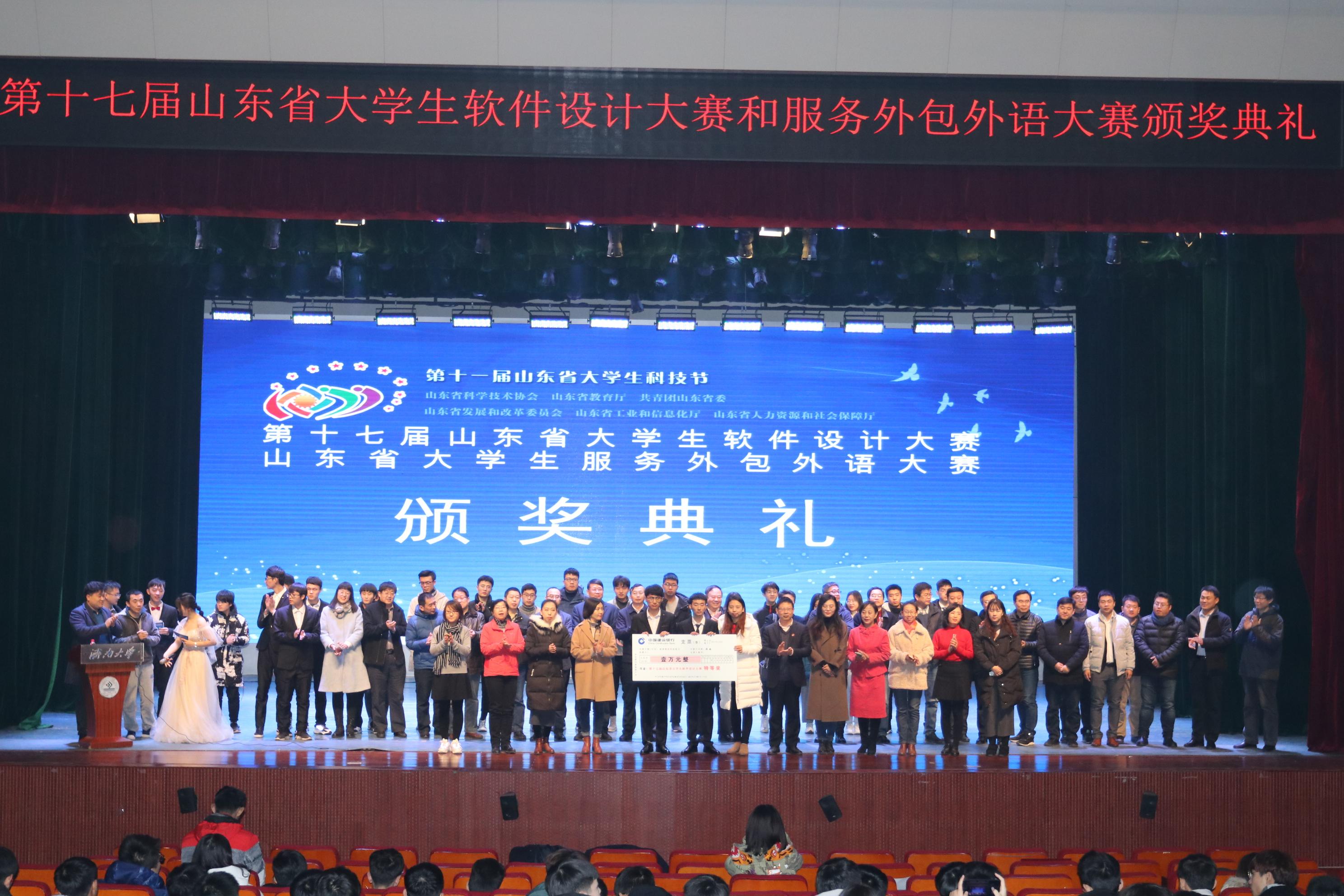 第十七届山东省软件设计大赛共有来自全省75所高校,1300支代表参赛队伍,6000人参赛。经大赛评委会评审,共评出特等奖1项,特等候选奖2项,一等奖97项,二等奖183项,三等奖289项。山东省服务外包外语大赛共评出一等奖9项,二等奖18项,三等奖25项。其中,太阳成集团tyc151cc参赛队伍共获一等奖8项,二等奖5项,三等奖23项,太阳成集团tyc539获得优秀组织奖。