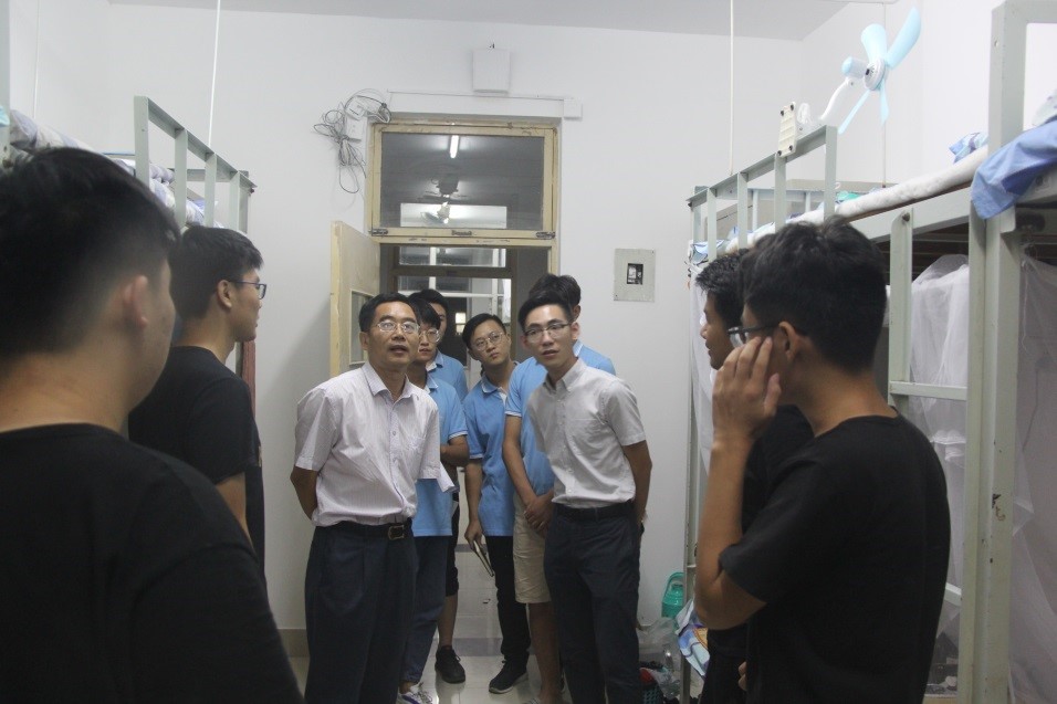 为了解新生寝室入住情况,便于新生更快地融入大学生活,9月6日晚上7点,学院党委书记邱鲁军、院长董吉文、副院长陈贞翔、党委副书记副院长董晓宁以及新生辅导员和学办老师对新生宿舍进行了走访,给新生送去了温暖。