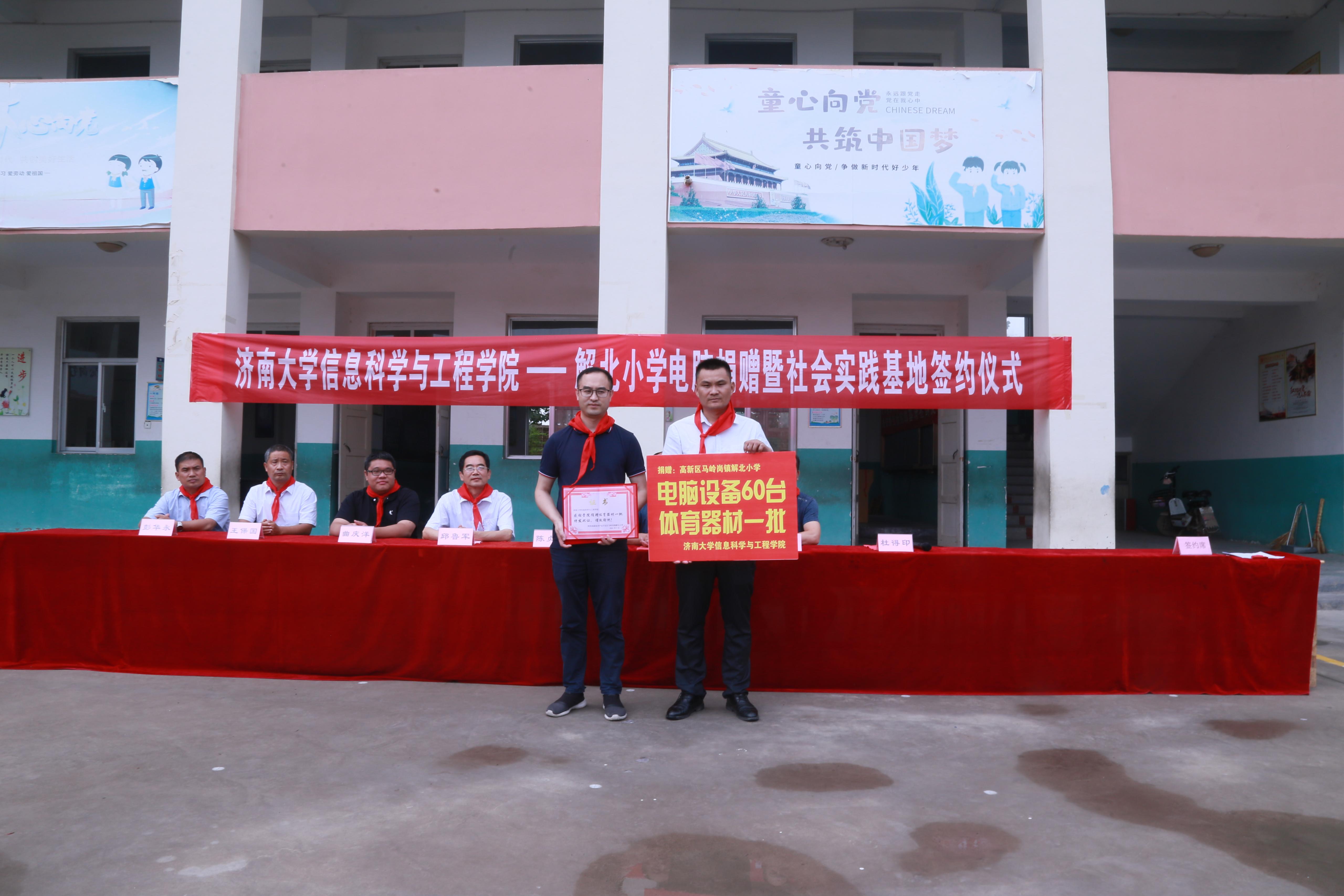 7月18日,太阳成集团tyc151cc与菏泽高新区马岭岗镇解北小学举行电脑捐赠暨社会实践基地签约仪式,学院党委书记邱鲁军、院长陈贞翔、菏泽市高新区马岭岗镇中心校和解北行政村党支部等有关负责人出席仪式。