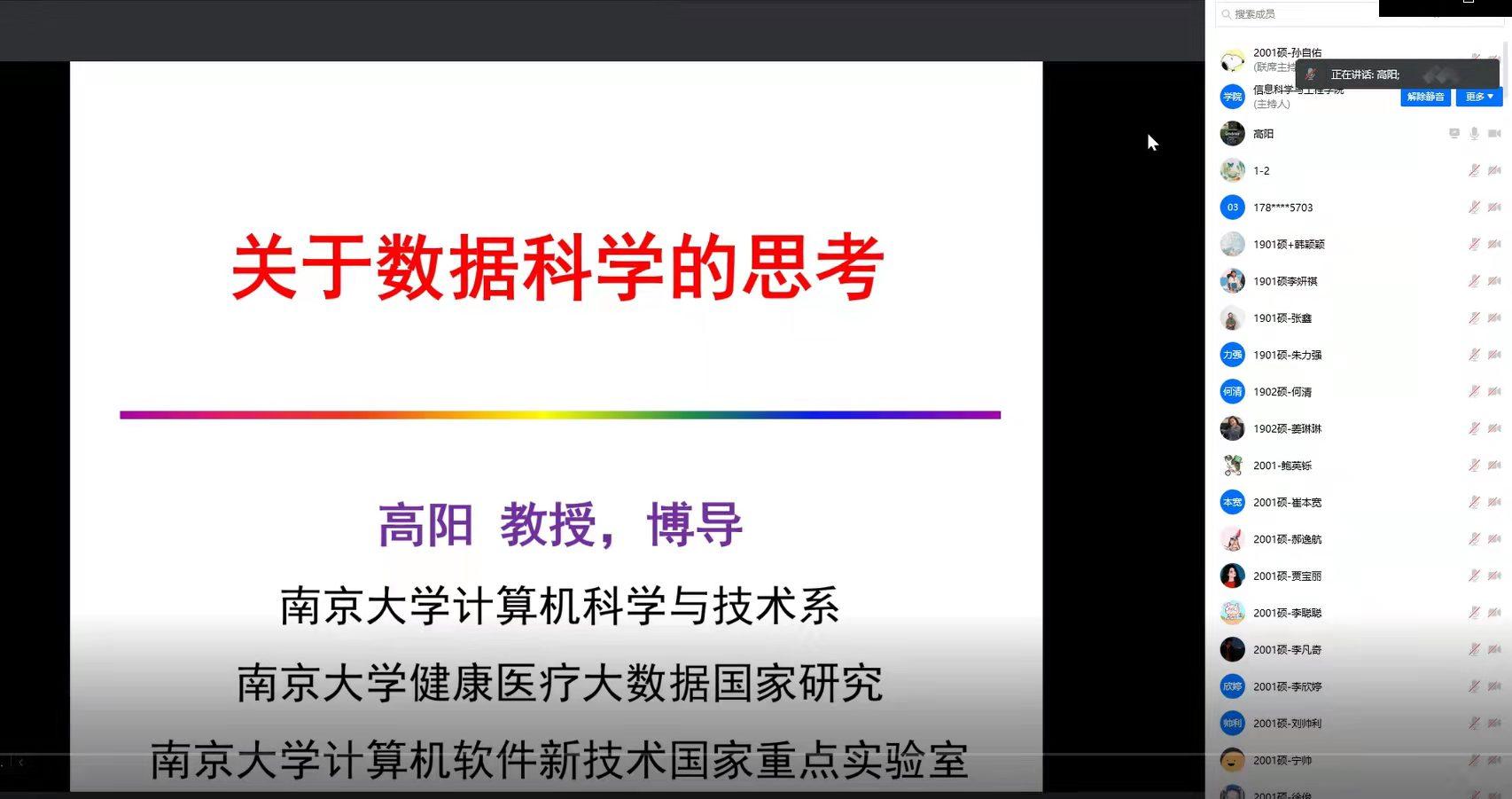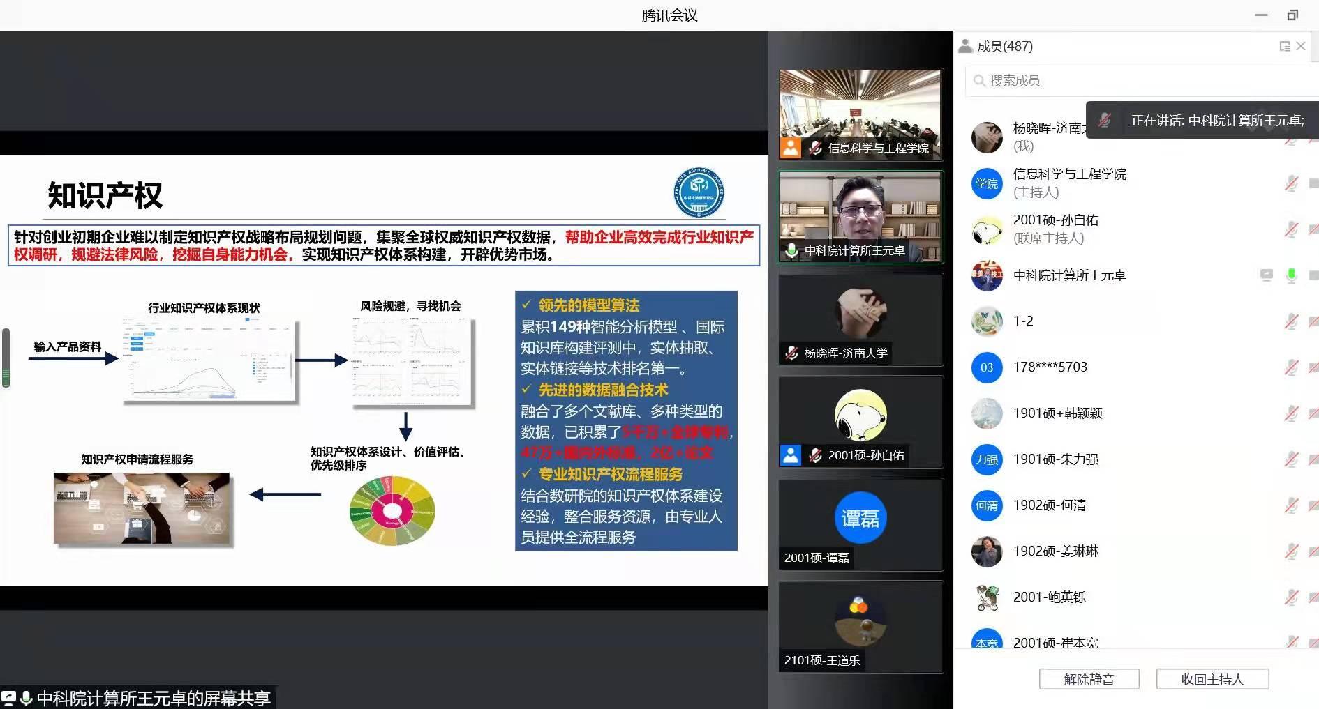 特邀报告阶段,首先由王元卓研究员为大家做了题为《大数据驱动的创新产业发展》的报告,对大数据的发展趋势和大数据的知识计算进行了探讨,然后介绍利用大数据研发的驱动创新发展的产业大脑,最后介绍在大数据创新产品研发的成功案例。高阳教授以《关于数据科学的思考》为题,对数据与大数据、数据分析与机器学习、数据科学与人工智能等技术体系进行了介绍,并从第四范式、数据性质、洞察力、通用工具等几个角度解析数据科学,给出其对相关问题的思考和回答。林子雨副教授围绕《大数据概念、关键技术及其产业化应用》讲述了大数据概念与关键技术,并分享了大数据相关产业化应用案例,带大家一起步入精彩纷呈的大数据时代。山大地纬副总裁史玉良的报告题目为《用电信息采集大数据平台深化应用实践》,介绍了用电信息采集大数据平台对智能用电的基础支撑,分享了其团队在用电信息采集大数据平台深化应用领域方面的实践经验与探索。最后,山东亿云信息技术有限公司CTO辛国茂和大家分享了《大数据在人才科创场景下的应用》,主要介绍了以多源异构数据智能采集、智能解析技术,以人才和企业为核心,整合区域高层次人才资源、技术平台资源等创新要素,构建人才科创知识图谱,实现产业链、创新链和人才链三链融合,为区域优化资源调配以及产业发展规划提供可视化分析支撑和决策依据。