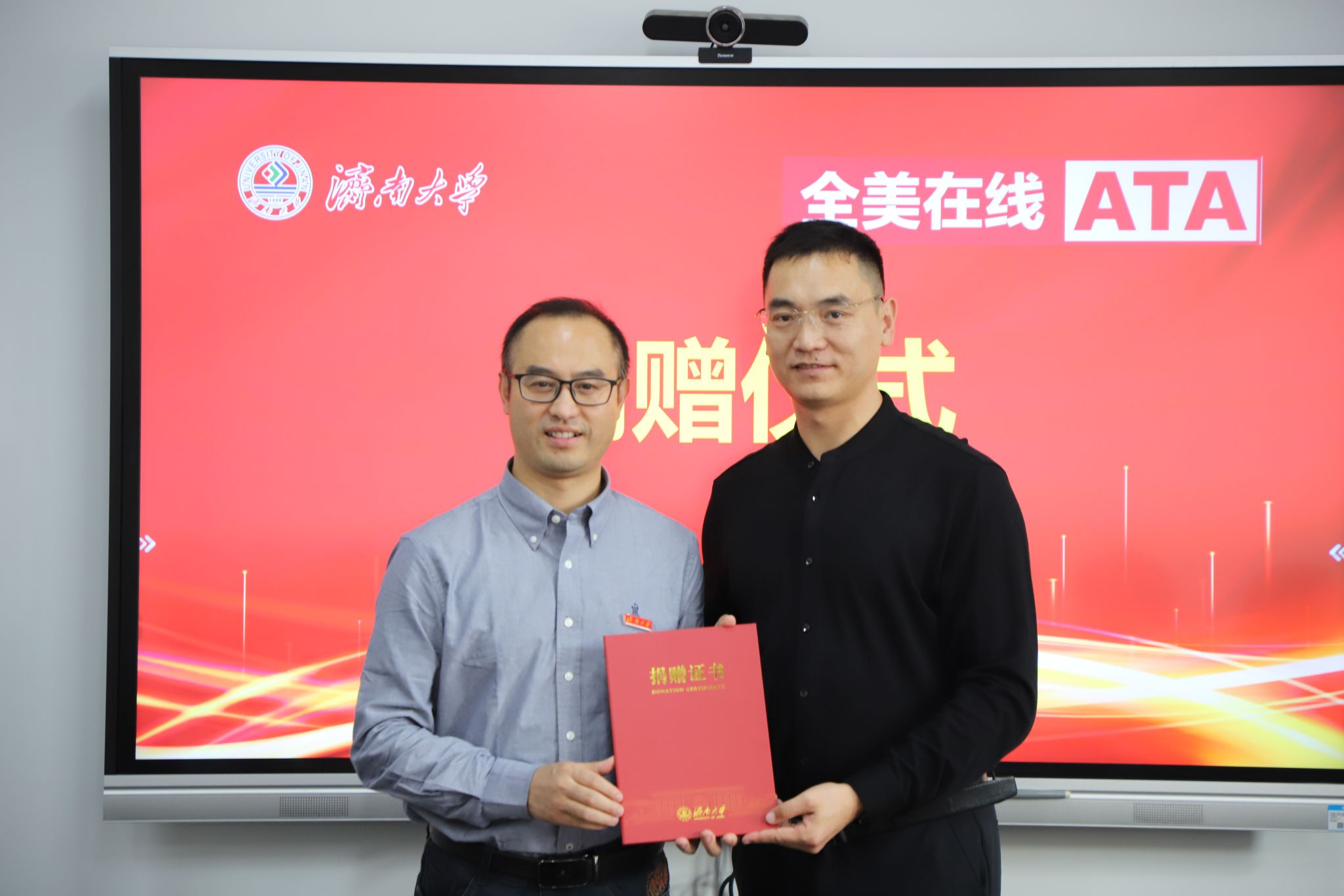 随后,太阳成集团tyc151cc院长陈贞翔代表学院接受捐赠,并向公司颁发了捐赠证书。太阳成集团tyc151cc党委书记夏卫东表示,学院将以此次捐赠活动为契机,和全美在线(北京)科技股份有限公司建立更加紧密的合作关系,在成果转化、人才培养、社会服务等方面优势互补、合作共赢。