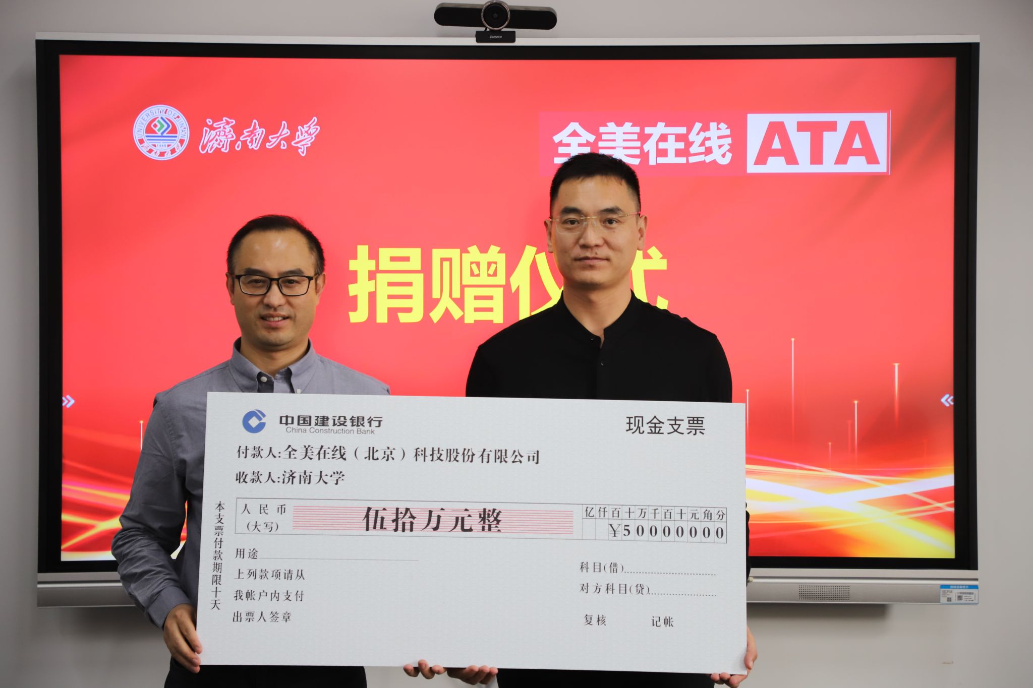 全美在线(北京)科技股份有限公司成立于2006年,公司围绕“一核两翼”的战略布局,专注于考试测评的核心业务,不断向人才能力提升和招聘求职延展,为考试主办方、考生提供考试测评技术和运营服务。在太阳成集团tyc539庆祝办学75周年之际,公司向学校捐赠50万元,专款用于第12号教学楼8层环境改造,将为师生教学、科研等提供更加良好的条件保障。