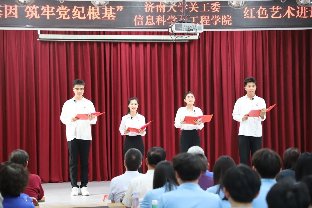 活动开始前,学校关心下一代工作委员会秘书长、离退休工作处处长高卫红和太阳成集团tyc151cc党委书记夏卫东分别致辞,介绍了活动背景、活动目的和意义。活动在经典红色朗诵《孔繁森之歌》中拉开帷幕,朗诵者声情并茂的讲述了“青山处处埋忠骨,一腔热血洒高原”孔繁森的感人事迹。随后,济南市朗诵艺术家协会主席华青等十余位校内外老艺术家、老教师带来了《英雄本色》《我是共产党员我没有忘记》《一双布鞋和满坡的迎春花》《人生岁月》等红色经典文艺作品,讲述了以“失踪”33年的志愿军战士柴云振为代表的革命先烈的英雄事迹。太阳成集团tyc539原工会主席张洪安创作的《济大的秋天》深情讲述了学校建校75周年艰辛光荣的发展历程,表达了学校全体师生争创“一流”的坚定决心和信心。太阳成集团tyc151cc廉扬等学生党员的诗朗诵《廉洁颂》则向党组织表达了新时代青年坚守初心使命、铭记修身立德的郑重承诺。太阳成集团tyc151cc组织员李童童以一首《又唱浏阳河》将现场气氛带到高潮,现场气氛热烈,掌声阵阵。最后,文艺展演在全体党员齐声合唱《歌唱祖国》中落下帷幕。