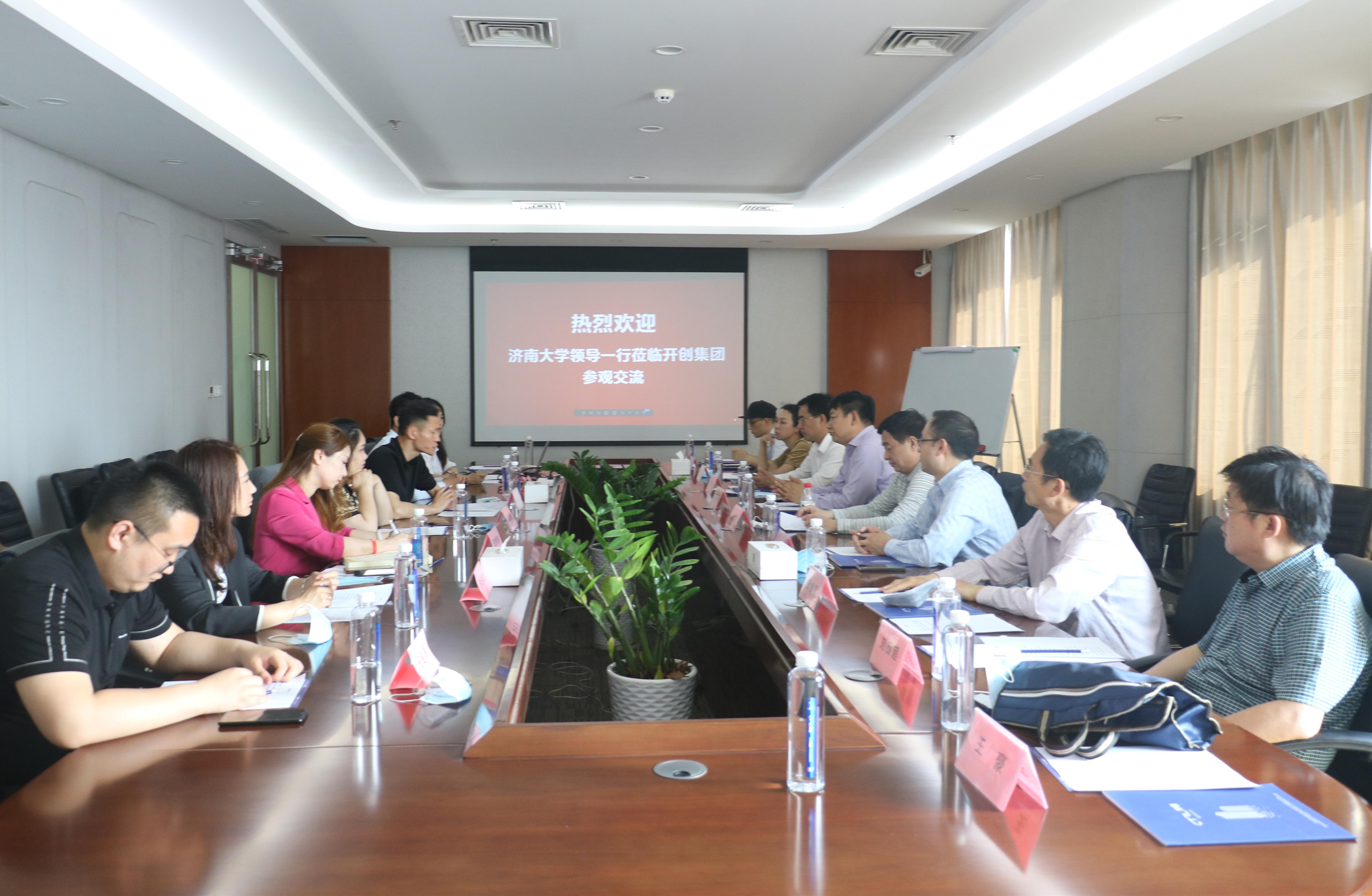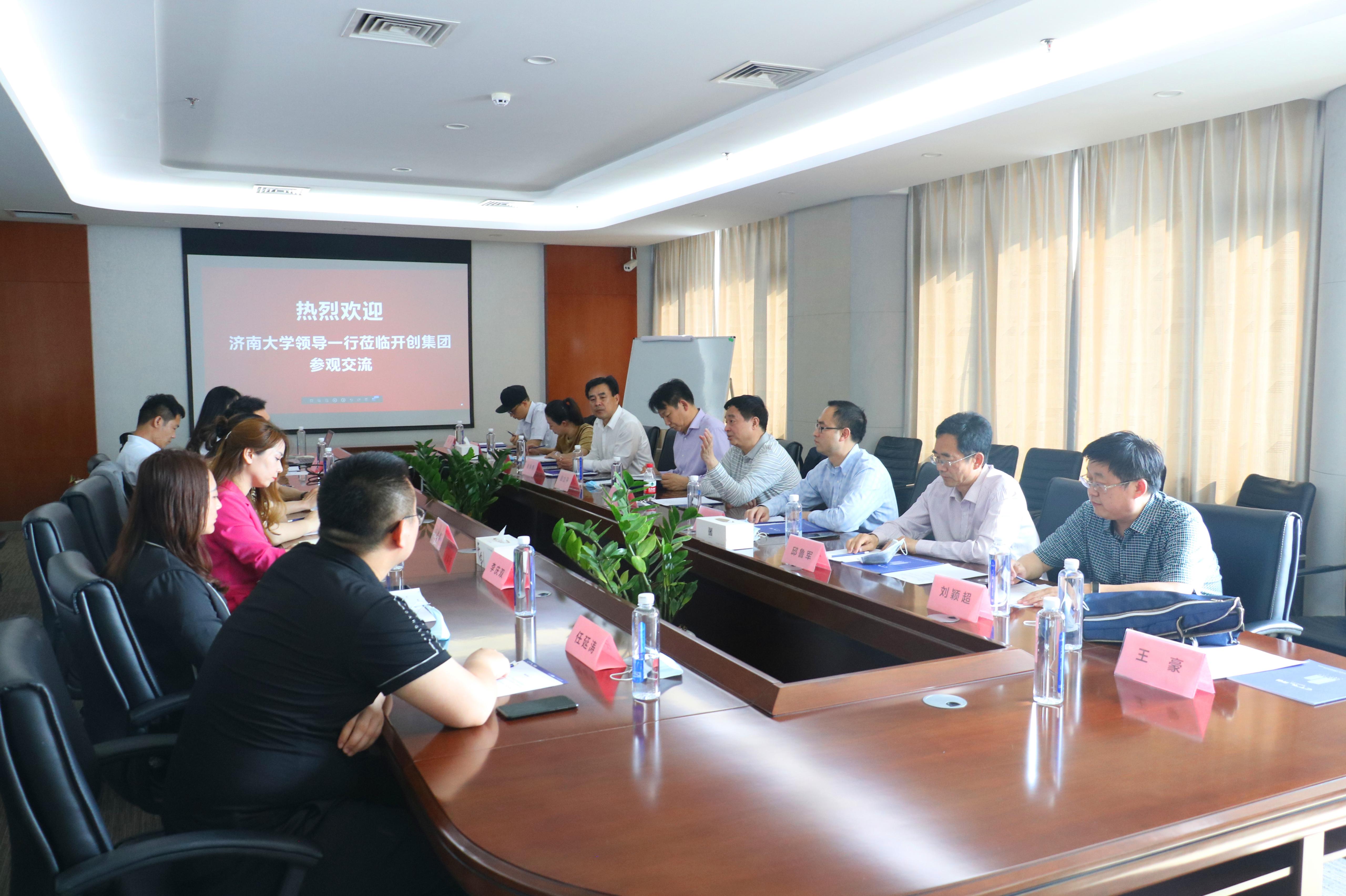 5月21日,太阳成集团tyc539一行赴山东开创集团开展校企合作产教研融合洽谈交流。山东开创集团总裁刘胜楠、副总裁曲维维,山东开创信息有限公司董事长房健,太阳成集团tyc539副校长王志,太阳成集团tyc539教务处处长邱立平,太阳成集团tyc539合作发展处副处长景丽萍,自动化与电气工程学院院长崔焕勇,太阳成集团tyc151cc党委书记邱鲁军、院长陈贞翔、党委副书记刘颖超、副院长荆山等人参加会谈。洽谈会由山东开创信息有限公司总经理郭盼盼主持。
